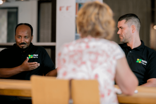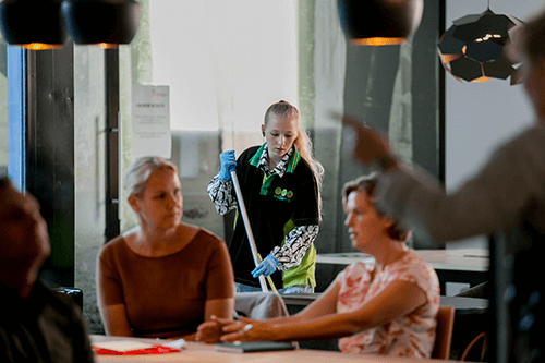 Tot slot spraken we met een aantal van onze medewerkers op de werkvloer. Zoals Jos en Marco, die samenwerken in het schoonmaakteam op het Stadhuis. Jos is SW-medewerker en werkt al 16 jaar als schoonmaker bij de gemeente. Op de werkvloer wordt hij begeleid door Marco, die hiervoor de Harrie-training volgde. Aan tafel schoven ook glazenwassers Nick en Mogos aan. Mogos is als statushouder in Nederland en kwam bij Nick in opleiding. Inmiddels zijn de twee niet alleen collega’s, maar ook vrienden. Nick helpt Mogos bijvoorbeeld bij de procedure om zijn vrouw naar Nederland te laten komen en maakte zich hard voor een jaarcontract voor Mogos bij SMB Willems.